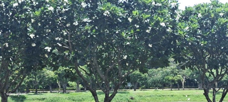 Plumeria trees wall the pond: