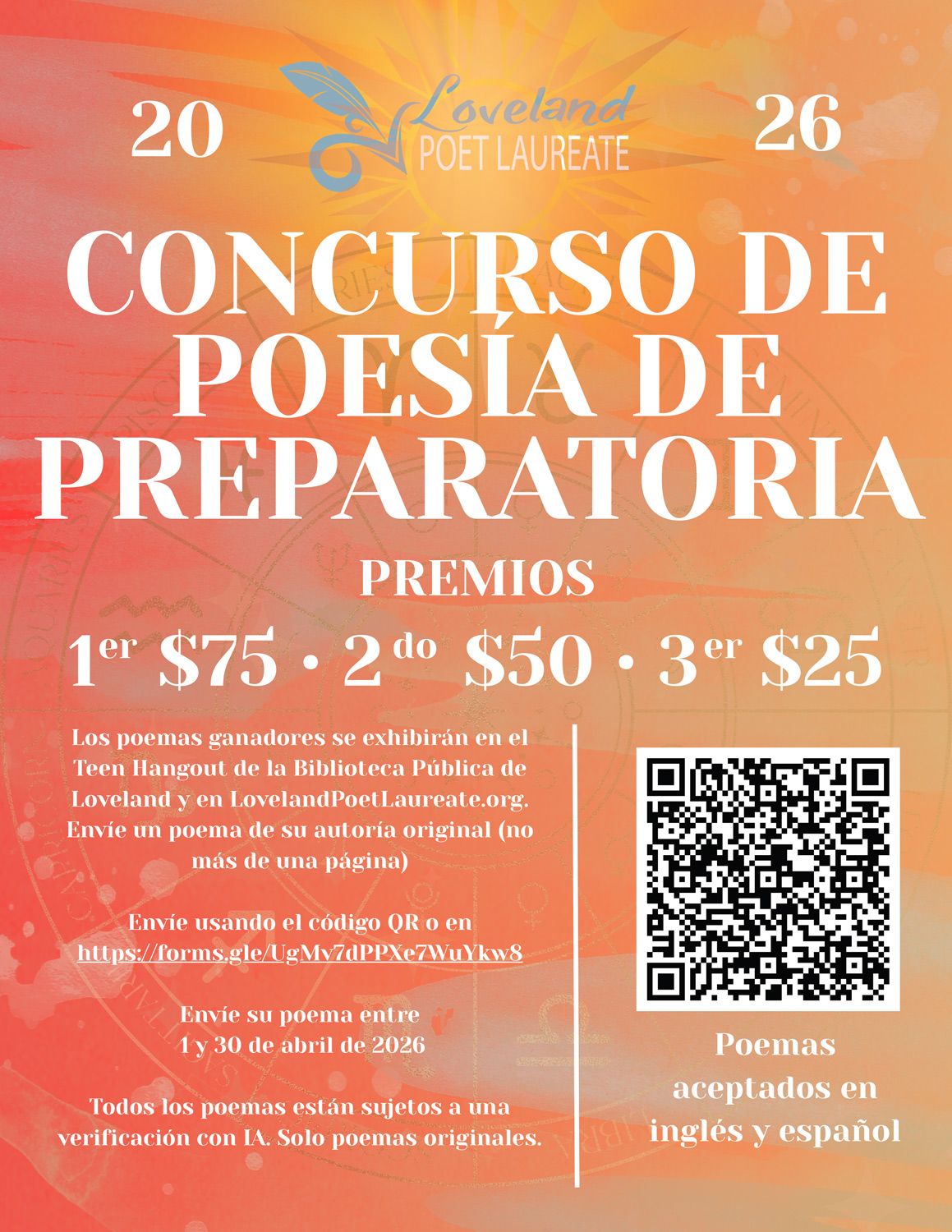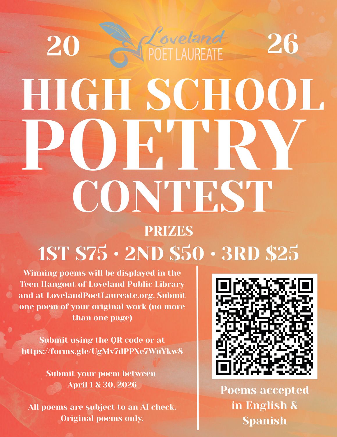 Los poemas ganadores se exhibirán en el Teen Hangout de la Biblioteca Pública de Loveland y en LovelandPoetLaureate.org. Envíe un poema de su autoría original (no más de una página).